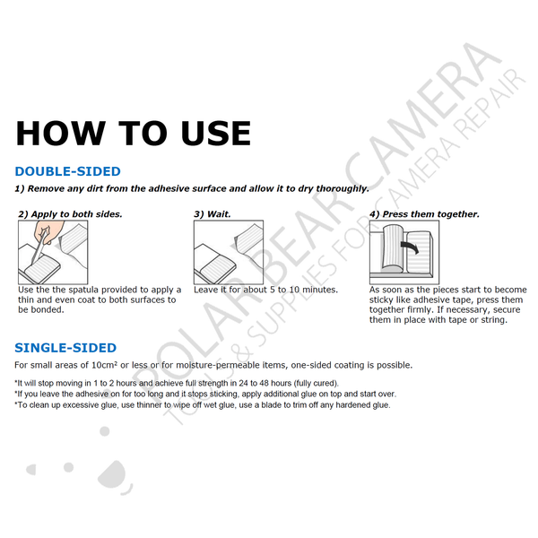 - Excellent glue for reattaching leatherettes to camera bodies and mirrors to mounting plates. Safe to use with plastic parts. The glue is solvent-free and does not tan plastic parts.